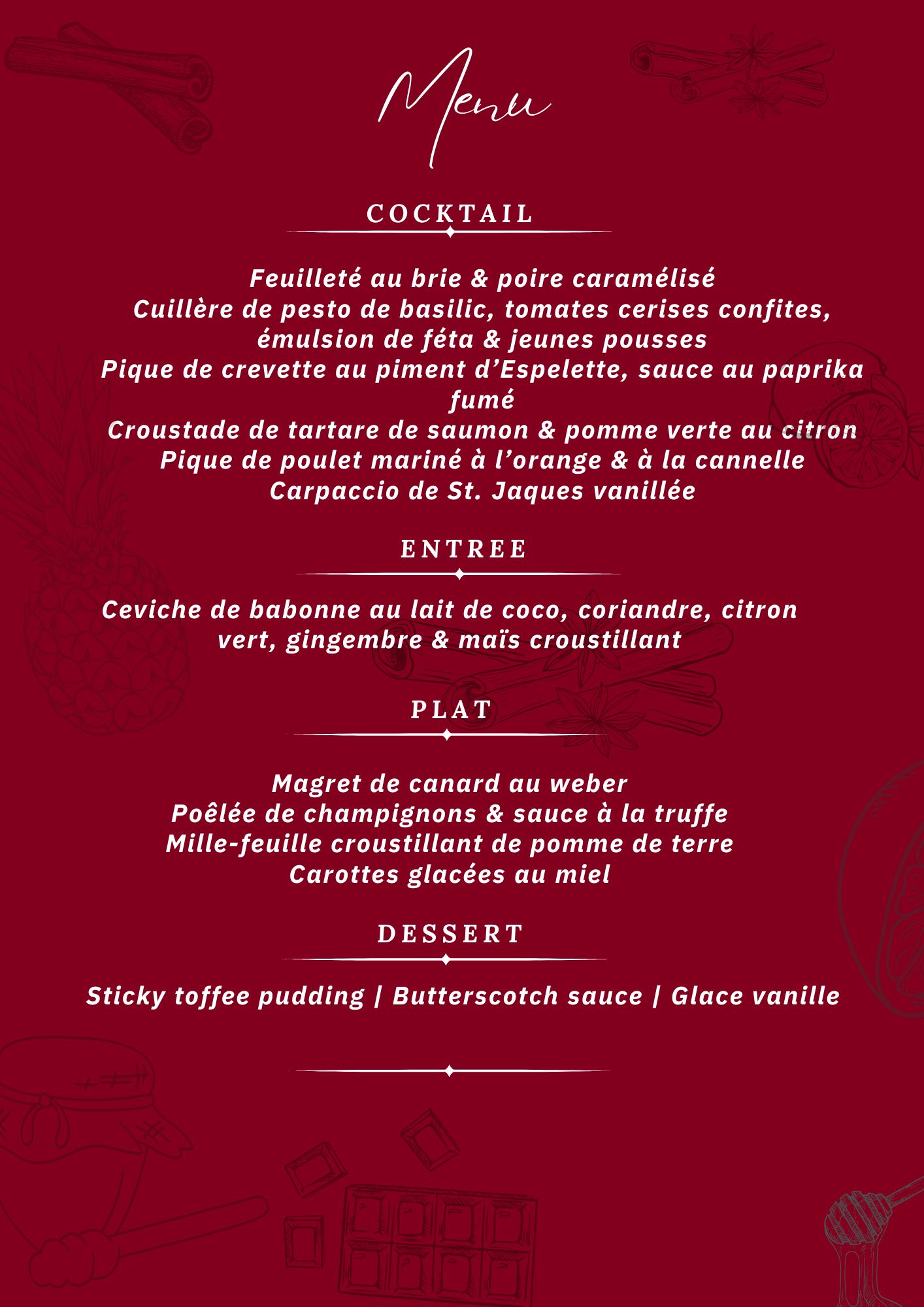 Kindly inform us in advance of any dietary restrictions or food allergies.