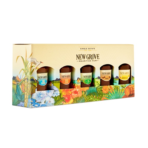 Discover the unique flavors of New Grove rum with this gift pack of 5 small bottles. Each bottle contains 50ml of rum, so you can try a variety of flavors without having to commit to a full bottle.
